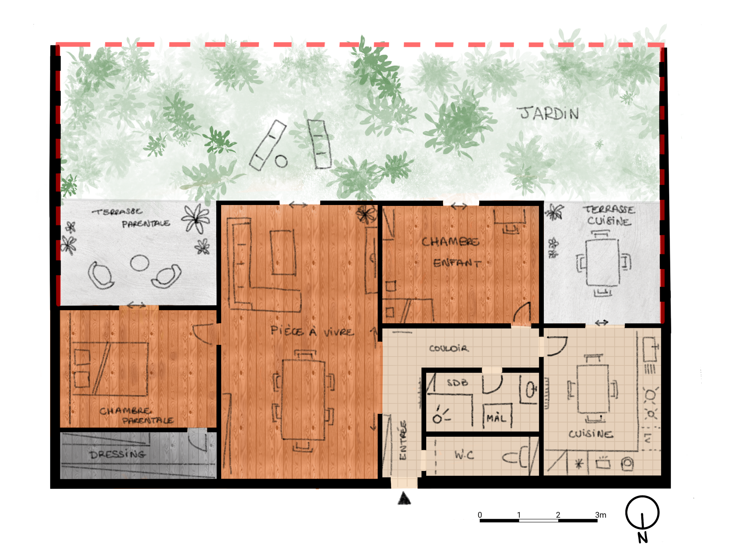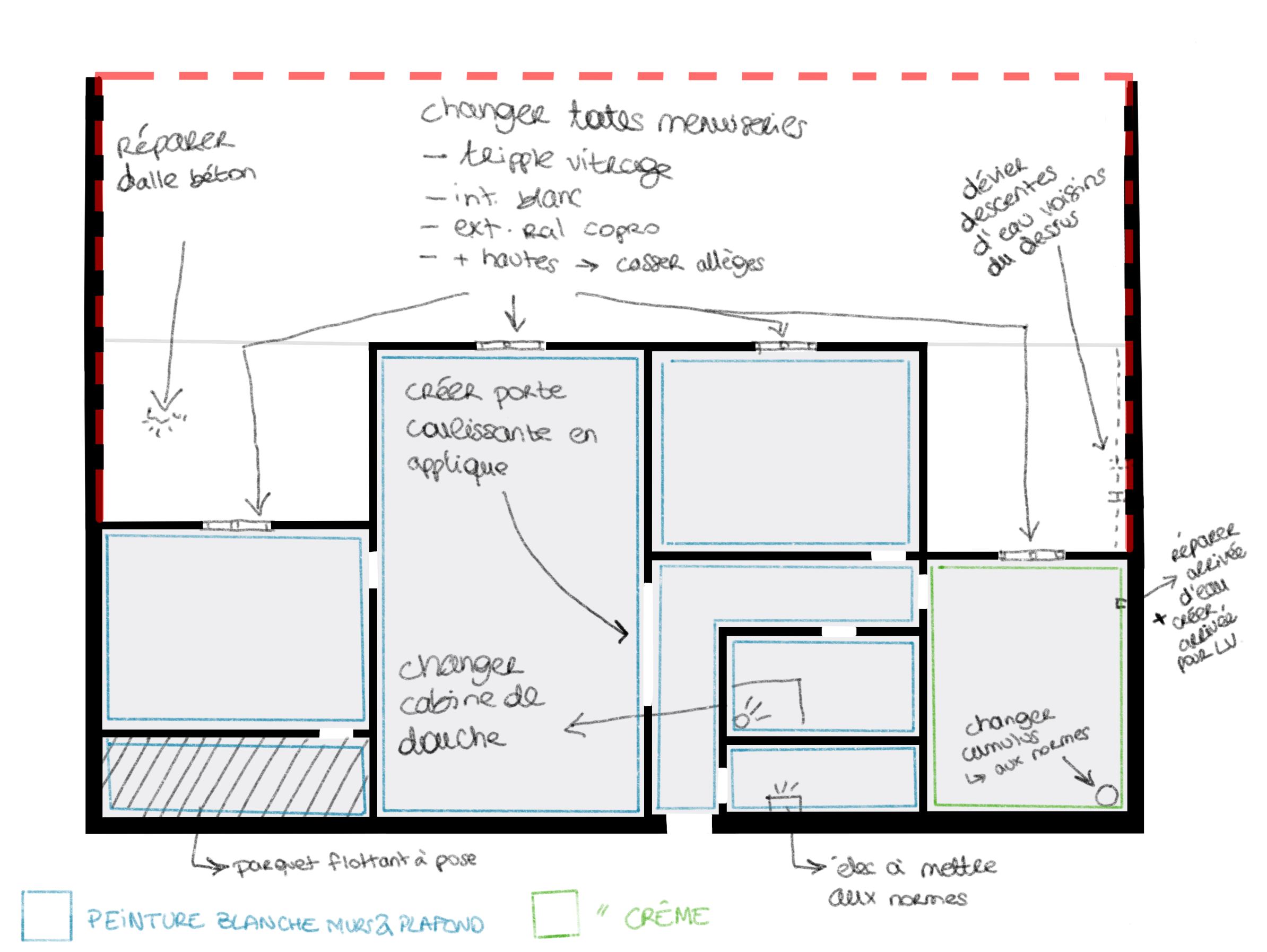 Réhabilitation d’un vieil appartement dans le centre de Cahors pour une famille composée de deux parents et d’un enfant. Mise aux normes de l’électricité et de la plomberie, agrandissement des ouvertures, pose de nouvelles menuiseries au RAL de la copropriété et de triple vitrage, peinture de tous les murs et plafond, pose de plancher flottant au sol d’un ancien cagibi, conversion d’un cagibi en béton brut en dressing, réaménagement des pièces, modernisation des équipements : cabine de douche, placards et électroménagers de la cuisine…